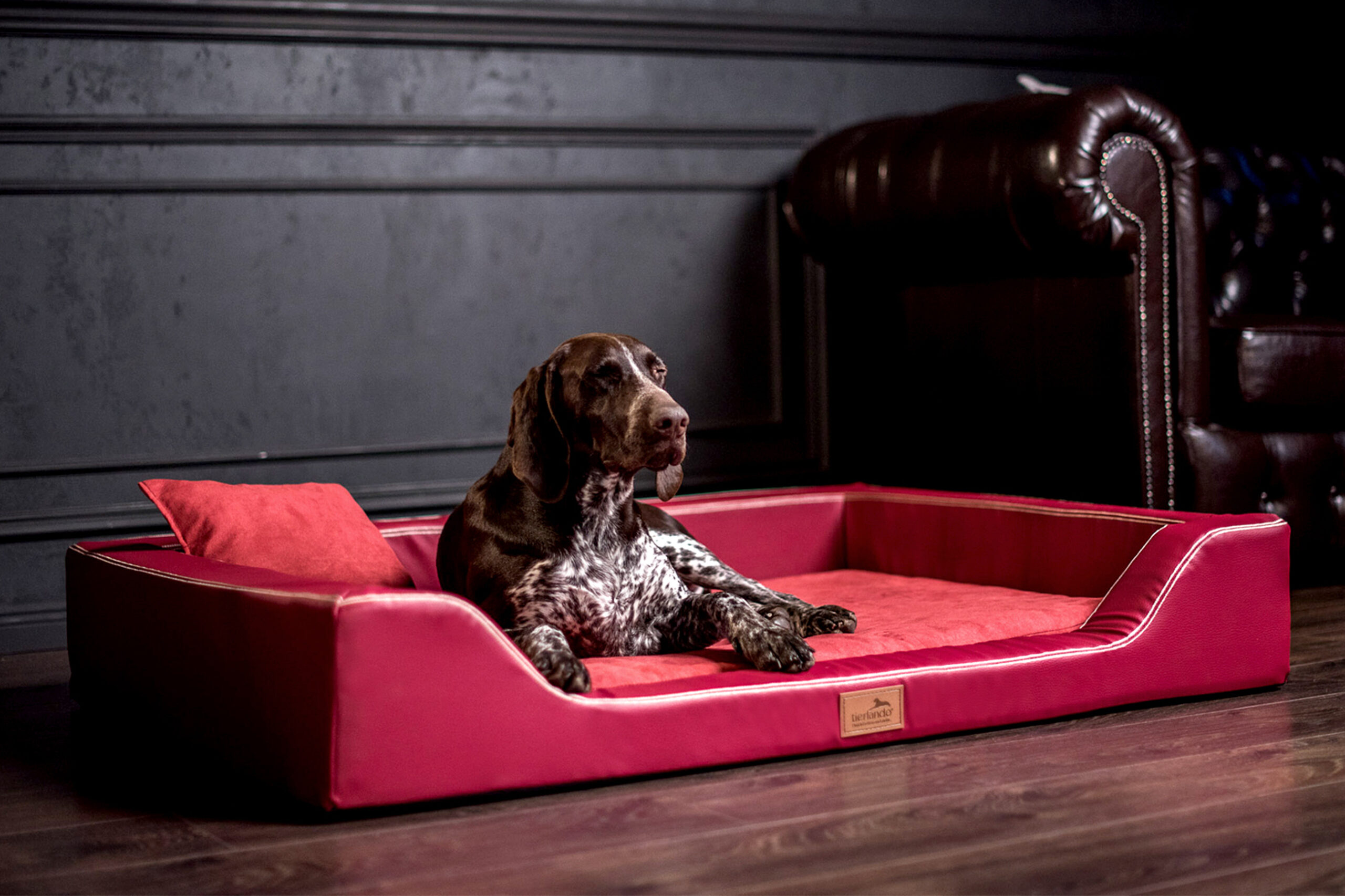 Ein Hundesofa der absoluten Luxusklasse! Das Hundebett MELODY wird ausschließlich in professioneller Handarbeit für Sie gefertigt. Dieses extravagante Modell wird aufwendigst veredelt. Unser Know-how im Bereich Hundemöbel hilft uns Meisterwerke zu schaffen. Ultra-Latex-Matratze bezogen mit pflegeleichtem & weichem High-Tech-Velours und Kunstleder oder komplett aus Kunstelder in bester Qualität, Punktelastizität und Formstabilität. Orthopädisches Hundebett im edlen Sofa-Design mit aufwendigen Verzierungen. Hundehaare und Dreck können schnell rückstandslos entfernt werden (Anti-Haar-Eigenschaft). Gesunder & ruhiger Schlaf im Luxus-Bett. Der hochwertig mit Kunstleder bezogene Rand umgibt die Latex- Matratze. Absolut pflegeleicht. Diese humanmedizinisch bewährte Materialwahl eignet sich für Hunde, die von Risiken oder Schäden an Knochen, Gelenken oder Wirbelsäule betroffen sind.
